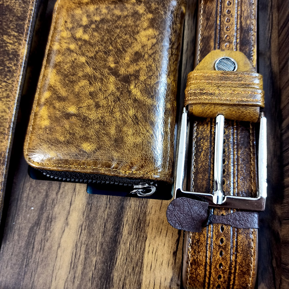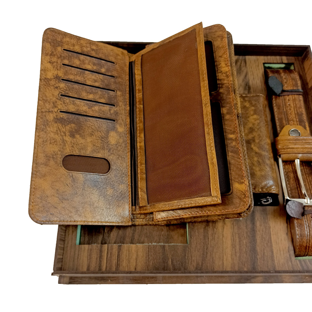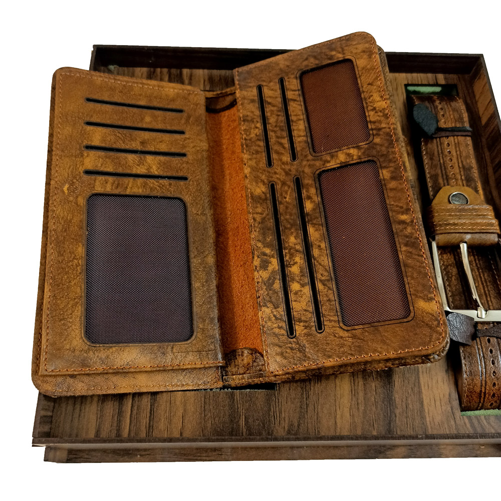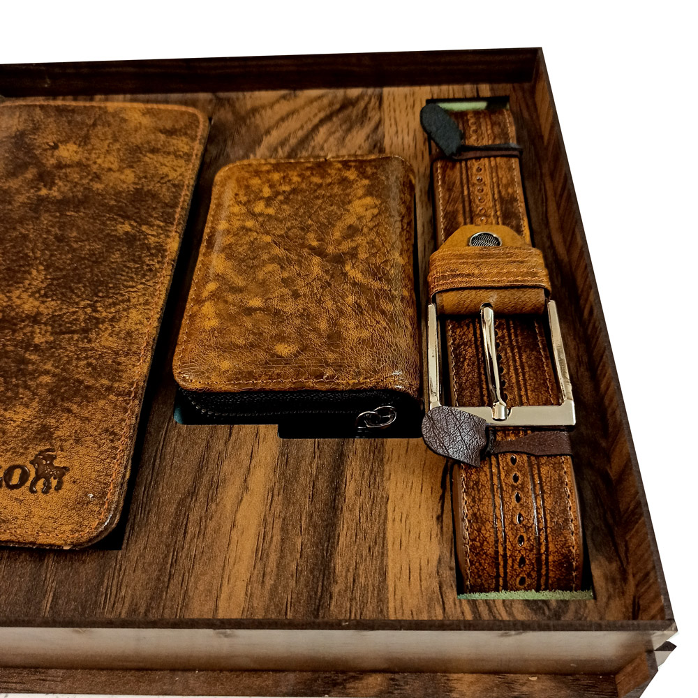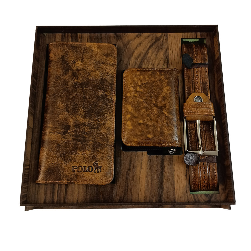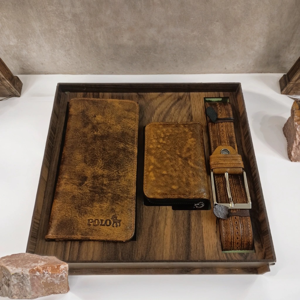 ست هدیه کیف و کمربند چرم طبیعی دست رنگ 3 تکه سوپر بگ باکس چوبی