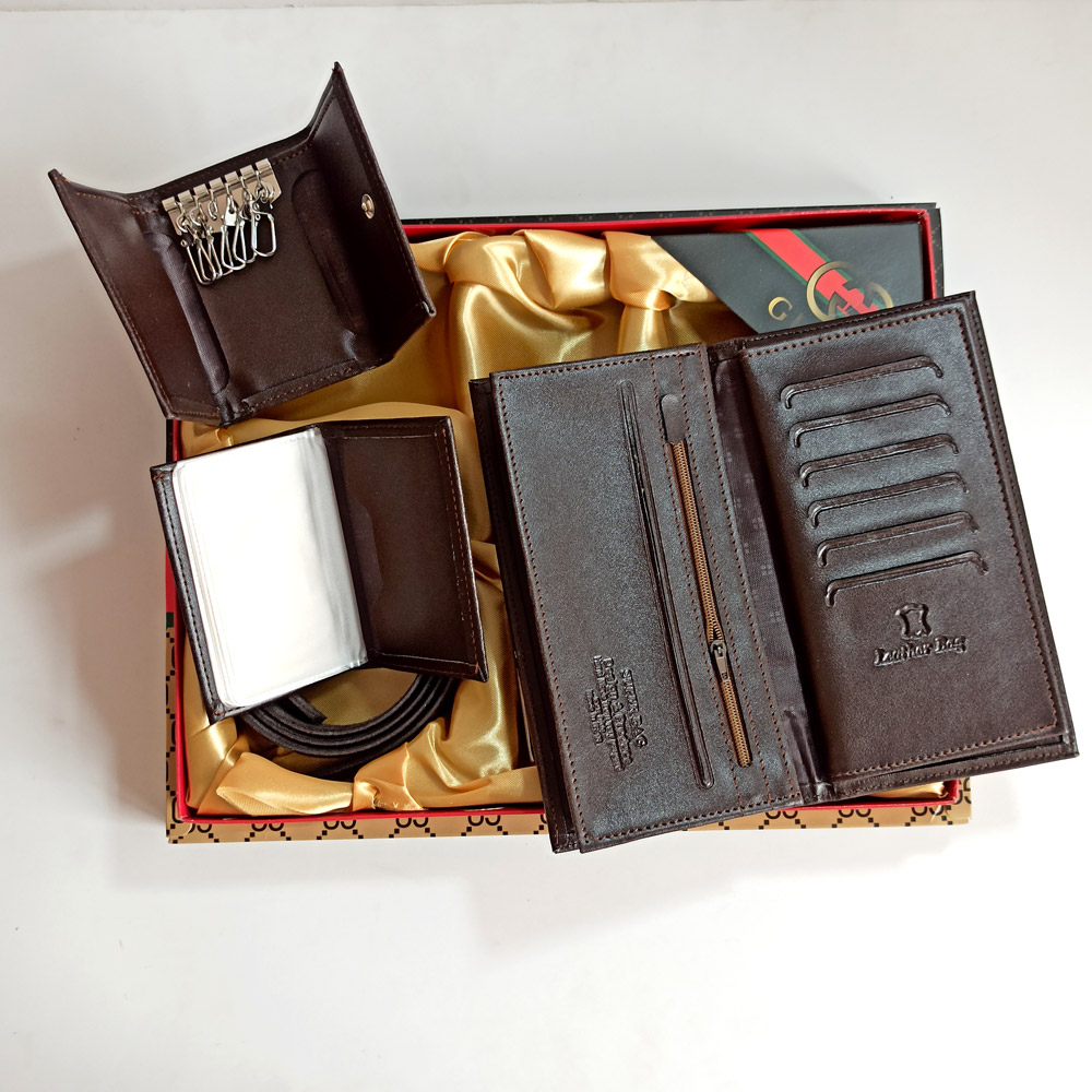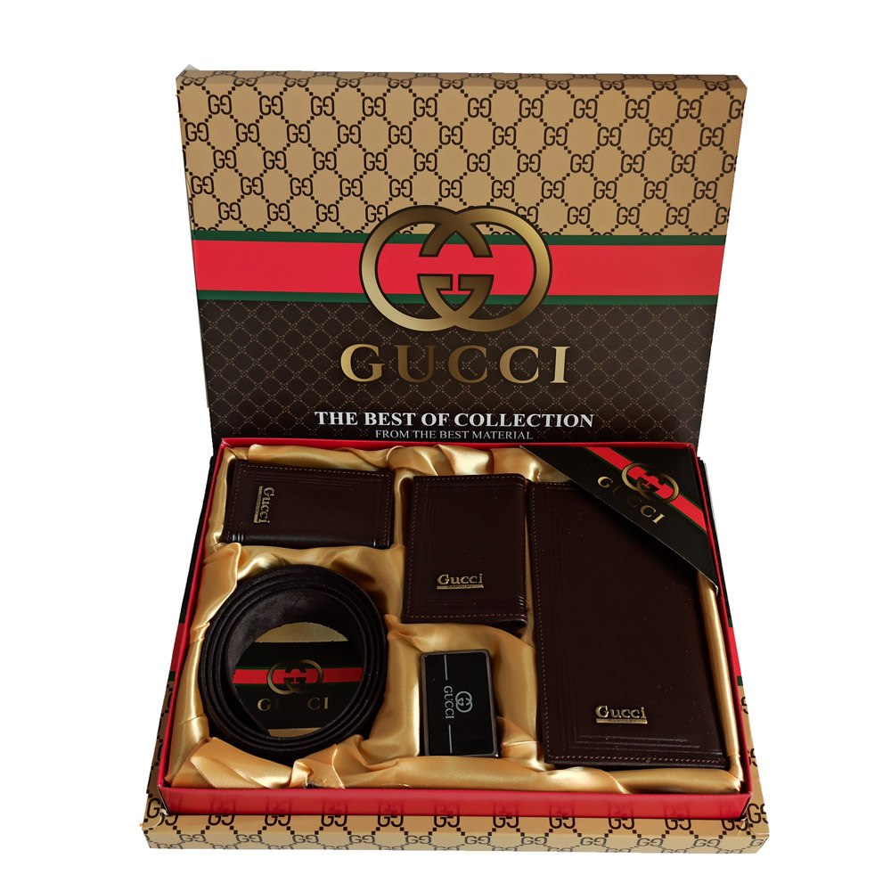 ست هدیه ۴ تکه چرمی قهوه ای گوچی | کیف پول، کمربند، جا کارتی و جا کلیدی مردانه