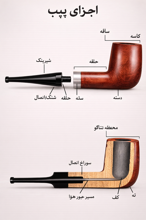 پیپ وسیلهای است که برای مصرف تنباکوی مخصوص پیپ طراحی شده و معمولاً از اجزای زیر تشکیل میشود: - کاسه (Bowl): محل قرارگیری تنباکو - دسته یا ساقه (Shank): بخش اتصالدهنده کاسه به دهانه - دهانه یا سری (Mouthpiece): بخشی که در دهان قرار میگیرد - فیلتر (در برخی مدلها): برایکاهش رطوبت و ناخالصیها