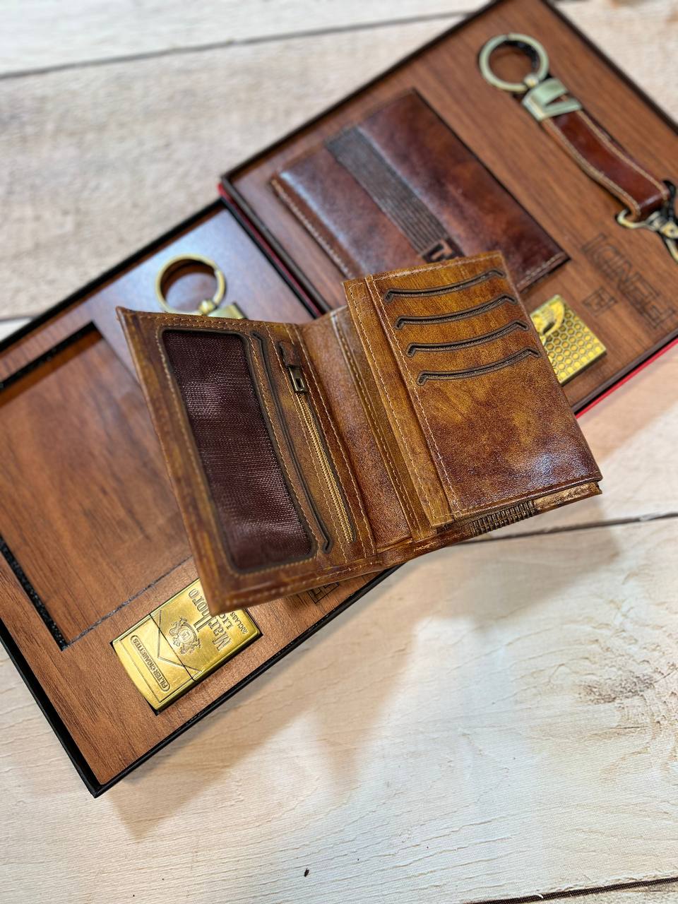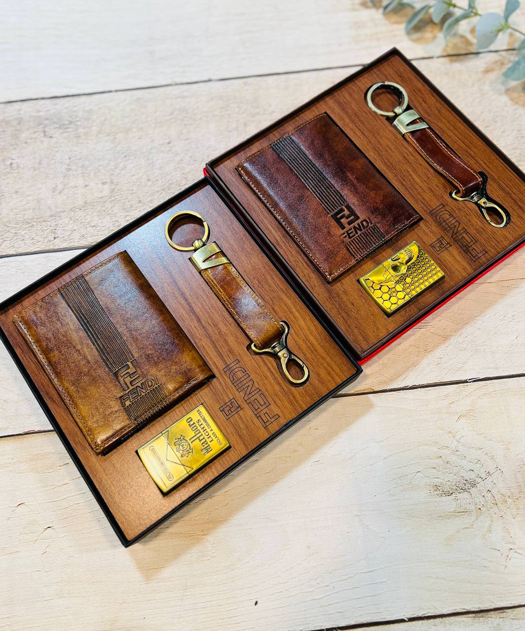 این ست هدیه مردانه شامل یک کیف چرمی و یک جاسوییچی به همراه یک فندک طلایی رنگ و یک باکس چوبی برای بسته بندی شیک است، که از نظر ظاهری و کاربردی بسیار جذاب است.کیف پول این مجموعه با استفاده از چرم طبیعی باکیفیت بالا و طراحی زیبا، اعتماد به نفسی از زیبایی و کارایی این محصول ارائه میدهد. چرم طبیعی کیف پول فندی از کیفیت بالایی برخوردار است که نشان از دوام و استحکام آن میدهد.کیف چرمی این ست مخصوصاً به عنوان یک لوازم جانبی به خوبی محل نگهداری تلفن همراه، کارت اعتباری، عکس، سیم کارت و مدارمک شناسایی می باشد. چرم به عنوان یک ماده بسیار قوی، انعطافپذیر و زیبا شناخته میشود و از طرفی ارزش افزوده و شیکی به هدیه مردانه شما اضافه میکند.جاسوییچی چرمی این مجموعه با یراق طلایی با کیفیت، زیبایی خاصی به این ست می دهد. فندک طلایی رنگ هم از نمادهای استیل و شیکی است که در کنار بسته بندی شیک باکس چوبی، تجربهای لوکس و جذاب از این ست هدیه ایجاد میکند.